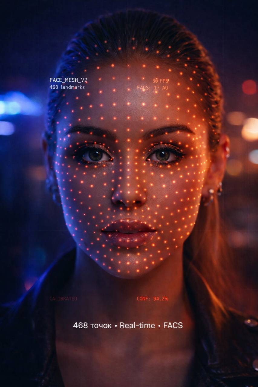468 3D-точок обличчя × 17 Action Units FACS. Система фіксує мікровирази тривалістю 40–200 мс — мимовільні рухи мʼязів, які виникають до свідомого контролю. При вербальній «спокійності», та раптові спалахи (страх розкриття) під час відповідей на цільові питання.